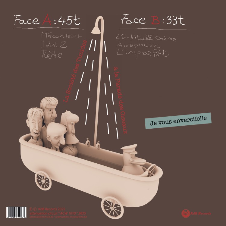 This release is nothing short of a sensation for attenuation circuit. After long years of fandom and the occasional STPO concert organised at the label’s homebase, attenuation circuit is proud and extremely pleased to co-release a new EP by La Société des Timides à la Parade des Oiseaux, the “Shy People’s Society at the Bird Parade” founded in 1984 in Rennes, France. With La STPO releases often spaced many years apart, we are all the happier to release one of these rare gems on our label thanks to a label collaboration with KdB Records from the band’s homebase in Rennes. Fans and collectors of La STPO may note that “Idol 2” is a direct reference to the track “Idol” on the band’s very first release, the 45-rpm EP “45 T”. As another reference to said debut, which was named after the speed of the record, the “33 T(ours)” of “Je vous envercifelle” are prominently displayed throughout the cover art.